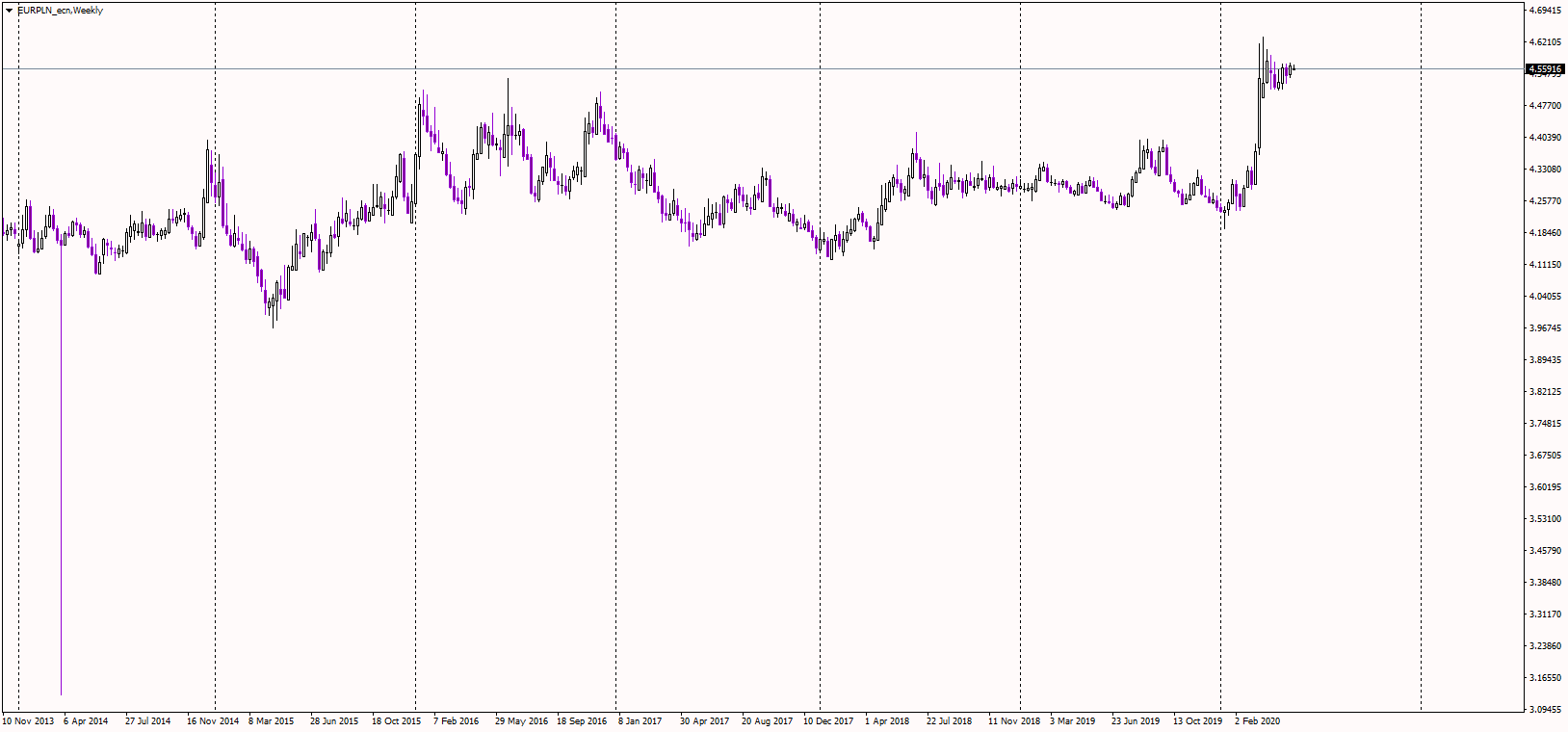 Jak můžete vidět z týdenního grafu krosu EURPLN, mnoho let byl stabilní a pohyboval se v pásmu 4.00 – 4.30. Výprodej PLN během koronavirové paniky však poslal kros na nová cyklická maxima nad 4.50. Vypadá to, že zde není mnoho příležitostí pro dlouhodobé investory, protože cena se pohybovala dlouhodobě do strany, ale krátkodobí obchodníci mohou těžit z vyšší volatility na krosu EURPLN.