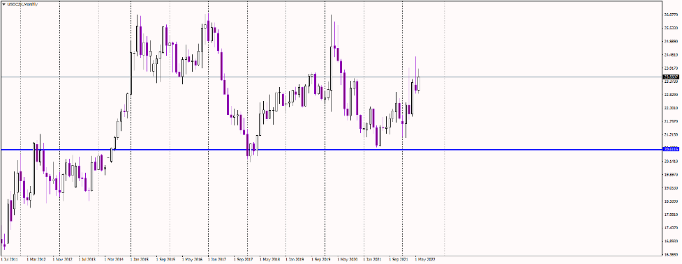 Jak můžete vidět z měsíčního grafu, kurz USDCZK se od roku 2012 příliš nepohnul. Cena vypadá cyklicky, reaguje na domácí i zahraniční zprávy, ale celkově je dlouhodobý trend jen mírně býčí, což naznačuje pomalé oslabování kurzu České koruny.