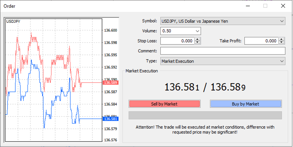 Měnový pár USDJPY můžete obchodovat na naší platformě DVV Group Metatrader 4. Nejprve najděte na platformě Metatrader 4 ticker USDJPY a stiskněte tlačítko nové objednávky. Zobrazí se následující okno.