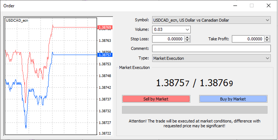 Pokud otevřete naši platformu DVV Group Metatrader 4, klikněte pravým tlačítkem na pár USDCAD a vyberte příkaz „nová objednávka“, objeví se následující vyskakovací okno: