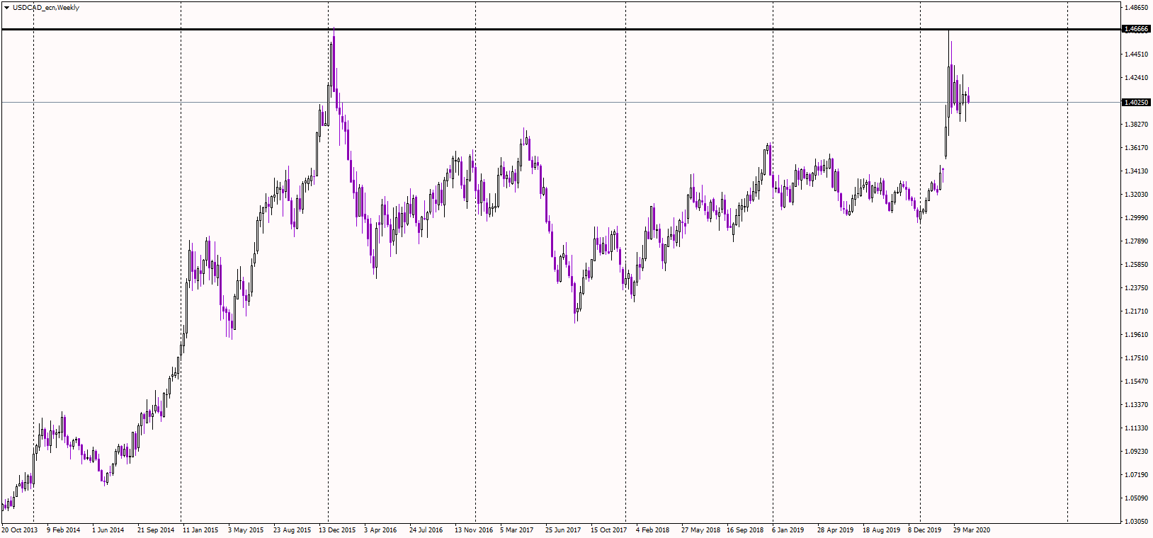 Od roku 2013 je pár USDCAD v jasném býčím trendu. Vyšší ceny USDCAD páru v roce 2015 byly způsobeny klesajícími cenami ropy, protože ropa se propadla k 20 USD. Tým pádem výrazně poklesl i Kanadský dolar. Nadcházející zotavení přineslo pár do oblasti 1.25 – 1.30 a byly jsme pár let svědkem obchodování do strany. V roce 2020 pár opět vystřelil výše a znovu testoval úrovně z roku 2015 kolem 1.45. Tato rezistence nebyla dosud prolomen, a vypadá to jako pěkný pattern dvojitého vrcholu. Vše bude záviset na cenách ropy.