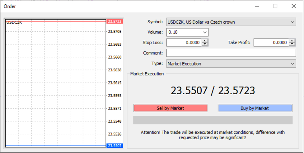 Měnový pár USDCZK můžete obchodovat na naší platformě DVV Group Metatrader 4. Nejprve najděte na platformě Metatrader 4 ticker USDCZK a stiskněte tlačítko nové objednávky. Zobrazí se následující okno.